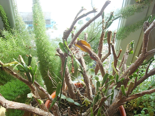 Himself brought Grandmother’s Christmas Cactus over from the studio today. It was not thriving over there and I thought it might like it here where there is a bit more heat and light. What you are seeing is a very large and very old plant that has sat outside each summer for as long as I’ve been acquainted with it. It was this big when I first saw it in 1979 so I have not a guess at how old it might be. But this summer the deer decided, one day when we were gone, that it was eatable . I think it’s going to survive but we were really bummed to see this damage. Since old Jack died the deer know no bounds. They come right up to the house and are not easily chased off. They are not a bit afraid of Cori the Corgi who can terrify a grey squirrel.