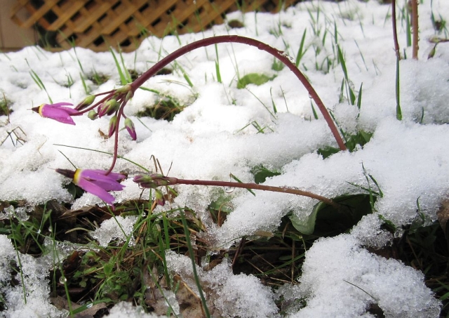 This little fellow is actually in Sis’ s yard but ours look pretty much the same this morning. We got between an inch and two of very light and fluffy snow. This morning the sun is out in a blue sky and the little breeze sets this stuff flying and falling all over again.
