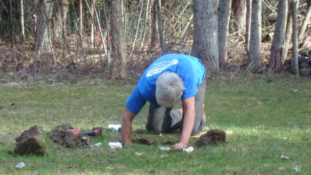 Here’s Randy out fixing the sprinkler he broke last fall by dropping a dead alder right on it! Good shot had he been aiming for it. but he’s good at plumbing, too and it’s all fixed for when that time comes again.