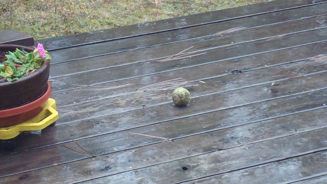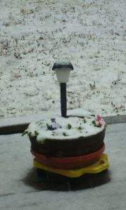 Next morning all the snow is gone again and it’s raining hard. Forecast is for more snow. Sure is spring! Cori’s abandoned tennis ball is laying out there with the drowning Primroses. She loves snow but opts to stay in if it’s rain. Can’t blame her.