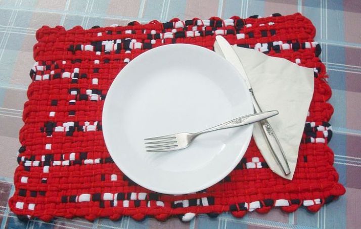 The new rug looms seems to be stirring up a bit of interest, I love it myself. I wove another place-mat yesterday after noon on the deck while listening to the game. Did not take very long, either. I want this set for the patio table. I like this bright red knit but I got a blister from the scissors cutting these strips last time and I need more. I might get out the rotary cutter and see if I can use that this time. This is a bit heavier than your average Tee shirt fabric. I have done a few using Tee shirt which I cut with the rotary cutter. Still, it was worth the blister! I like the way they turned out.