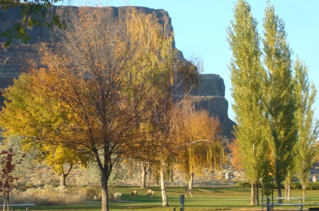 And since we spent our ‘vacation time’ this year building a new shop we decided to come home the long way. We went east from Monroe and explored Washington, Idaho, and into the western part of Montana. What a huge variety of country, everything from forested and craggy mountains to miles and miles of nearly flat country, not quite desert and not quite prairie. Long green valleys surrounded by bald and rolling hills. And the fall colors were brilliant. This photo was taken at Steamboat Rock Campground in Washington, not far from Boulder Dam, which we also visited.