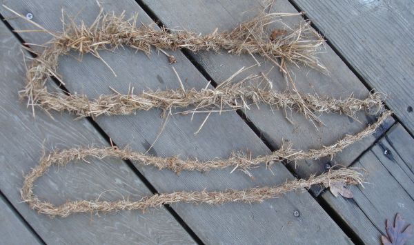 I tried it again, and I did ‘card’ it some tho mostly that just made a mess of my hand cards. But I think it did help some and I made little rolags… sort of… from the results. So this is today’s rope. It is finer, tho still rough. Part of that is that the fiber is still not entirely fiber, some is still needles. I need to further process it without breaking up the fiber too much. But it’s better!. I spun this on my thigh. Our local Indians did not have spindles, they were hunter-gatherers so the ropes they made were probably made this way. I haven’t gotten any cedar bark yet.
