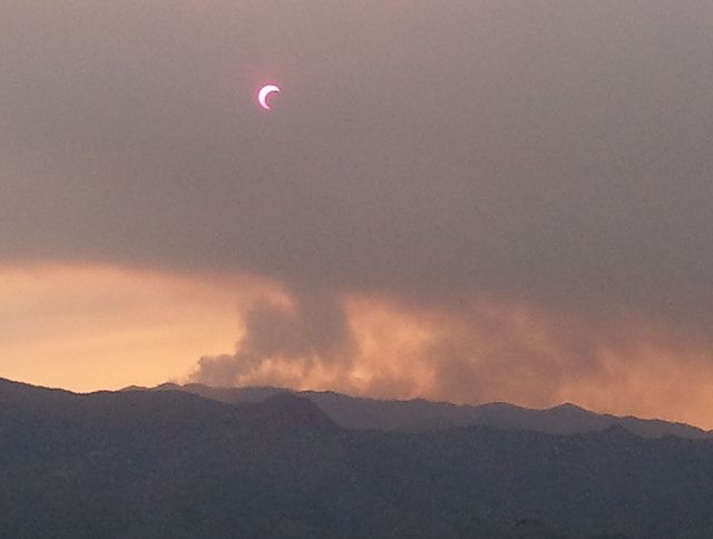 This one was taken by an internet friend in Arizona. The thick smoke from the forest fires they are suffering now acted as a filter for this eclipse. Is that looking on the bright side?! lol They were not in the right line to see the full ring but I found this effect very interesting.