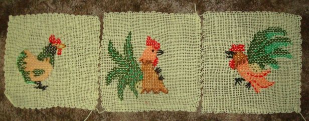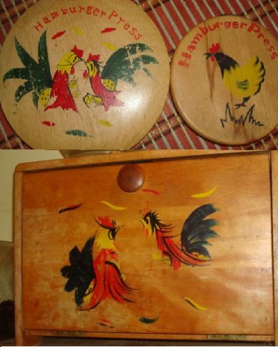 How time flies… whether you’re having fun or not! Well, I guess I have been having a little fun. It’s getting the garden in time, doing all the chores that were neglected all winter. But I have been weaving, too. Have been inspired to try a couple new (to me) techniques on the looms. One is transparent weaving where you weave a net-like base and weave pictures with colored yarns in that base. On a “traditional” looms you weave it as you go. On the 12″ Quilt Weaver Square (what I am using) I make a large “weavie” and then weave in the picture. It has involved some interesting challenges but I think I am getting it. In some ways, doing it like this is kind of like embroidery but yet it is still weaving. This is destined to be a kitchen curtain. A valance, actually. The pictures come from my bread box and a couple wooden hamburger presses that are only decorative pieces in my kitchen. I think they are 1950′ or maybe even ’40’s. Antique, vintage, or retro, take your pick! lol