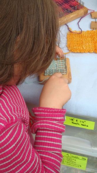 This picture shows a very new weaver! She’s just 6 years old. She told me that she already knows how to crochet so it is not surprising that she caught right on to weaving as well. She finished her little square here and Mom bought her her own loom. I am sure it will not be long before she has many projects to share. She went off happily to find yarn!