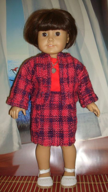 Susanne from Benny fibers in Montana gave me this skein of yarn at OFFF and I wanted to thank her so wove a little pouch using the 4×6 Mutli and noticed that this color-way wove up into a really nice Scottish looking plaid so decided to make up a school suit for my AG doll. I think it turned out really nicely. I also made a dress for Skyler Hopscotch. Weaving is such fun!