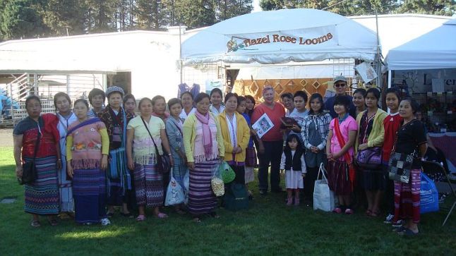 And then a large group came by. Not all of these people came into the booth at once, of course! They are refugees from Burma and several of them were very interested in the looms and this kind of weaving. They are all, or most all, weavers themselves and were wearing lovely examples of their weaving skills, but found this kind of weaving new to them. A small group of them came in and tried their hand at weaving the Quilt Weaver square. I gave them a copy of my book and I was asked to sign it. First time I’ve been asked for my autograph! lol We enjoyed a nice long visit.