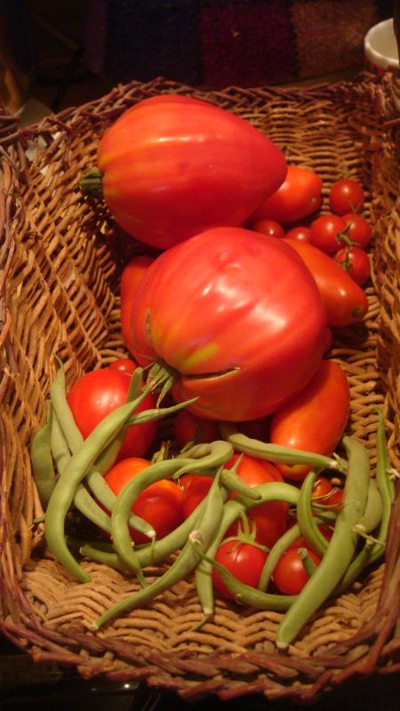And the tomatoes are getting ripe at last. I think I have an orange one, too. These are heirloom Oxheart. They average almost a pound a piece & are very tasty. There’s also one early girl, a roma type, and some cherries.