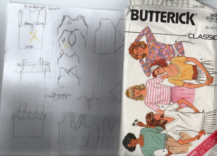 I went though knitting books and catalogs and watched what other people were wearing, keeping note of those things I thought might be possible to make with the small looms. The sketches above are some of the ideas I noted down. Not all suitable for the looms or for me but you want to make copious notes to start so you have something to work with. Find a sewing pattern that fits you. Try thrift store if you don’t have one on hand, they’re pretty pricy these days. It doesn’t have to be a fashionable pattern, just a pretty simple one that has the correct measurements. (You do know you’re going to have to measure yourself, too, or get a buddy to. Don’t try fudging here, you won’t like the results and you’re going to have a lot of hours in this project.)
