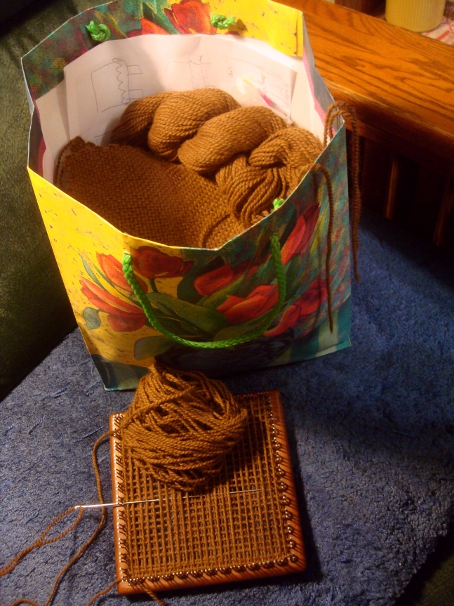 Okay, Next thing is a project bag. This keeps all the bits and pieces in one spot so you don’t lose them between weaving sessions. Don’t kid yourself that you’ll remember what closet you put your loom in and which drawer the pattern is in and which bag the yarn is in and etc etc. Keep it together. Here’s mine.