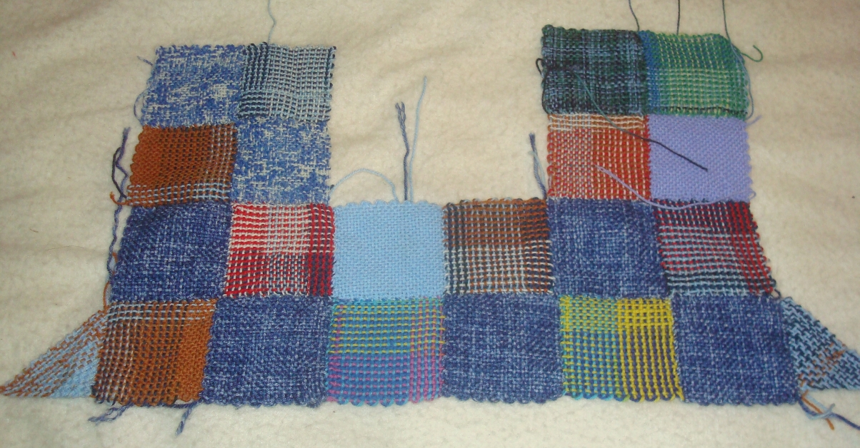 I am still weaving squares for my tunic but thought I’d do something with this bag of little ones, meantime. I think I mentioned that I’d… Had An Idea! So I worked on it a bit today.