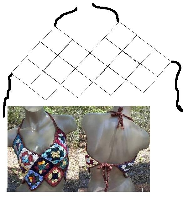 If you’re looking forward to summer and have the ‘figger’ for it, here’s a pretty simple top for hot weather. Your teen could wear this. The woven blocks should be a fairly tight and modest fabric but would still be lighter and more comfortable than this crocheted version probably would be. Something like a soft cotton or one of the bamboo, silky yarns might be good.