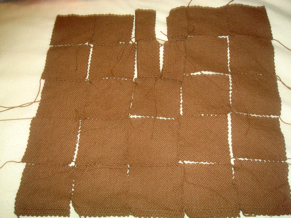 Okay, but I don’t think my initial guesstimate was too far off. I scooted the cat over and laid them out on the bed. Laid the pattern out over them and came up with a couple modifications. Not entirely happy with it yet, but I still have more squares to weave so time to mull it over.
