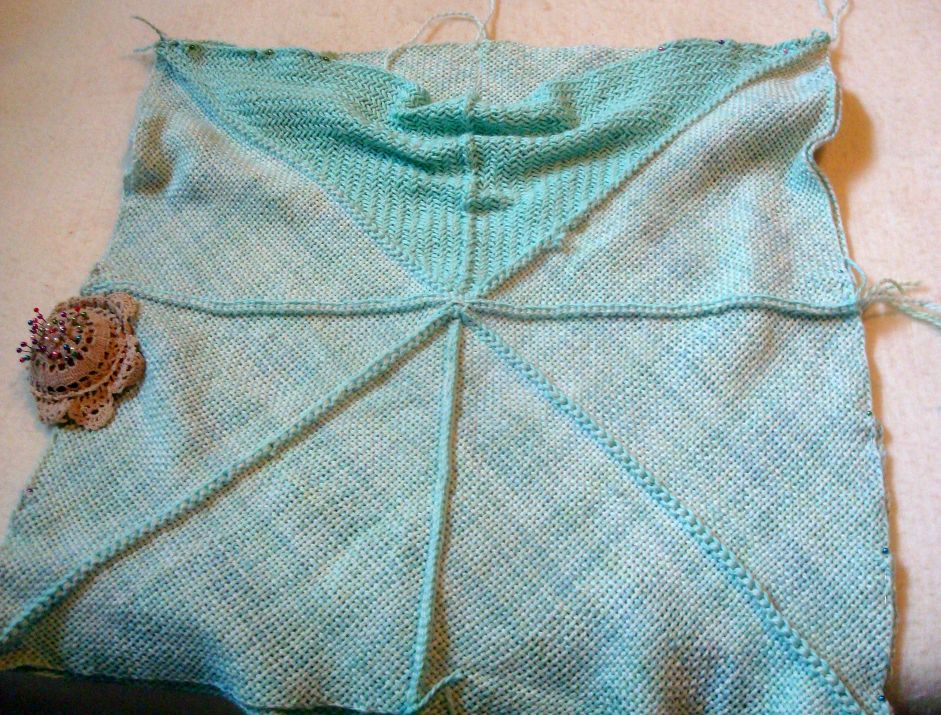 Got the top pinned together and am sewing up the shoulders and sides. Fit is pretty good, near as I can tell but… same ole same ole… It needs sleeves. No, I need sleeves. I think this would be cute as a sleeveless top on someone with firm young arms. Mine need sleeves. Not sure how I’m going to go about that but will be working on it. Here it is so far.
