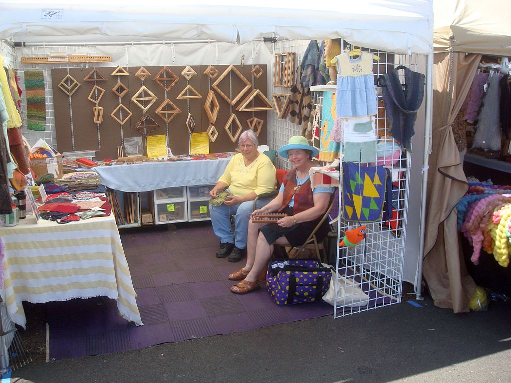 We’re back from Black Sheep Gathering, in Eugene, Oregon. Had a wonderful time with Jane Grogan who came all the way from Wisconsin to teach weaving in Oregon. She wore her vest woven on the 4″ square Multi. which I didn’t get a close up of. 😦 But here we are in the booth where we got to weave together when she was “off duty”.