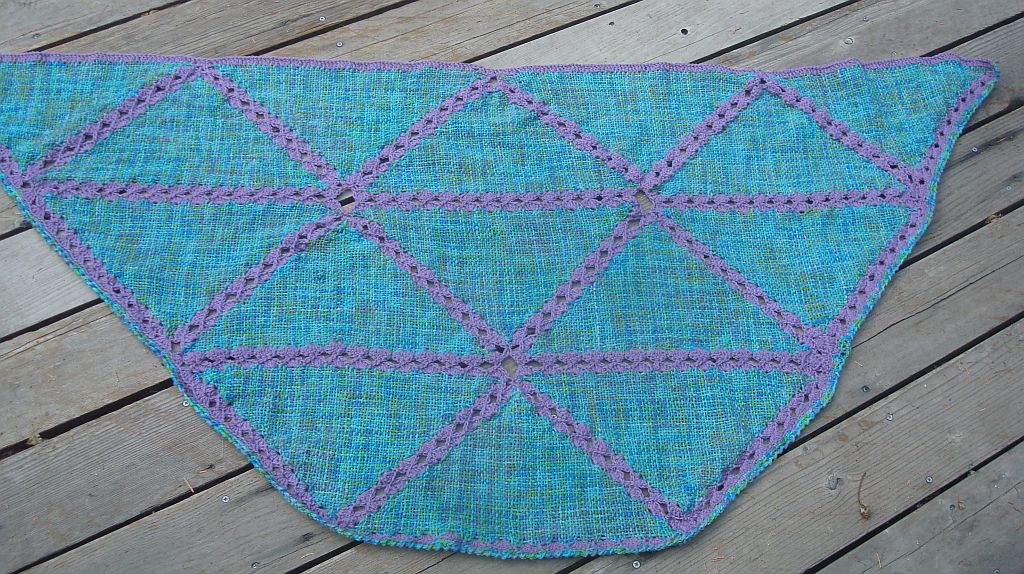 My shawl measures 62″ wide by 30″ deep. My yarn, a soft merino, had a lot of draw-up so my tris are about 11″ on the side. Yours will likely be larger depending, of course, on your yarn and weaving tension. The shell join adds about an inch to each seam.