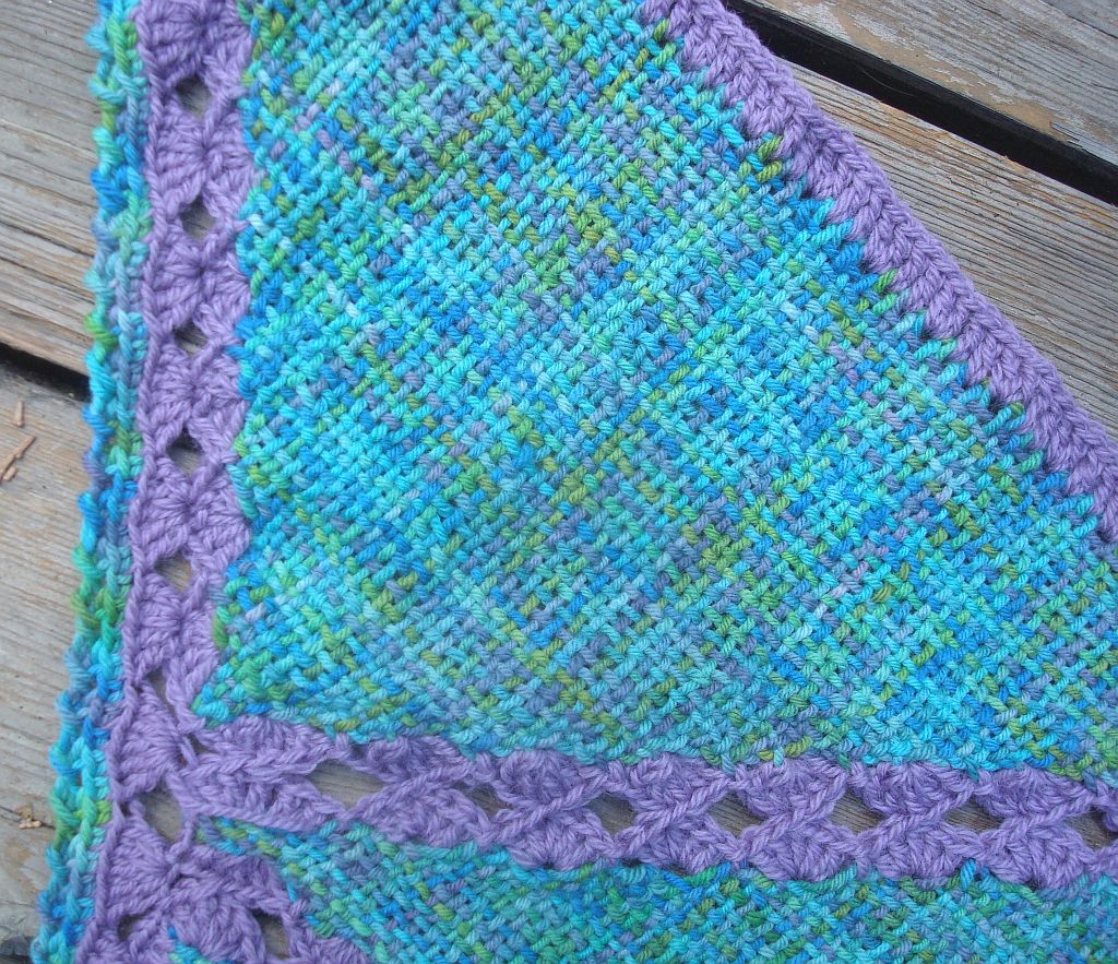 The join, in case you’re liking that, is a 5 stitch dc shell. Since I used the 14″ Tri it worked out this way: On the short side: 2 sc, skip 1 loop, *shell, sk 2, slip stitch, sk 2* but you’ll need to adjust for your size. It’s the same basic thing so not a problem how many you skip or don’t skip. To join, work the same thing but dc 3 then slip your hook out and into the center stitch of the opposite shell and draw the loop though, then dc two more to finish the shell. Try to keep the right side up, which I failed to pay attention to at first, but it really doesn’t show much in the shawl unless you really look for it. I finished the shawl edge with a row of sc and a row of reverse sc in the shawl yarn and the top edge is just dc adjusted to lay flat.