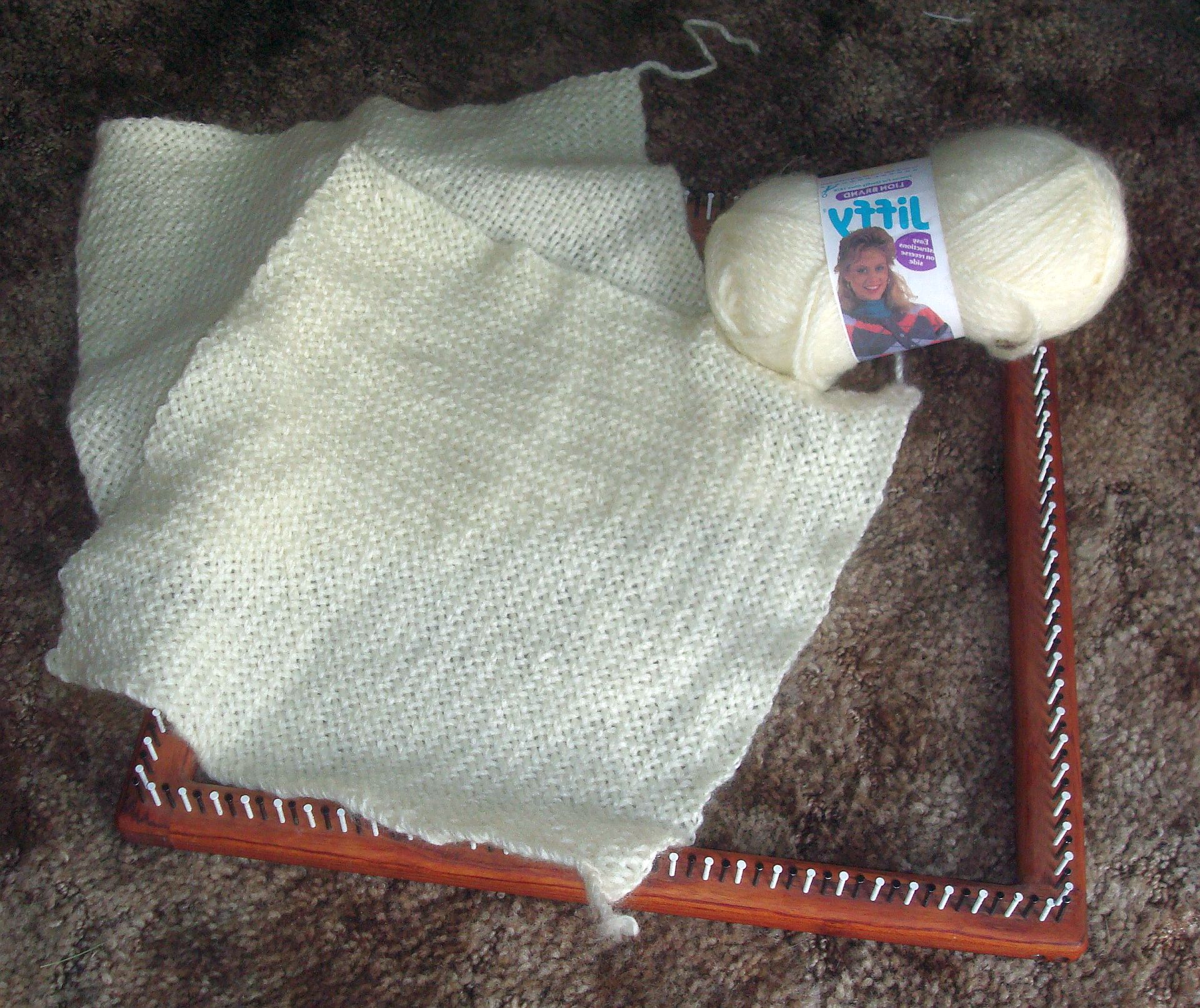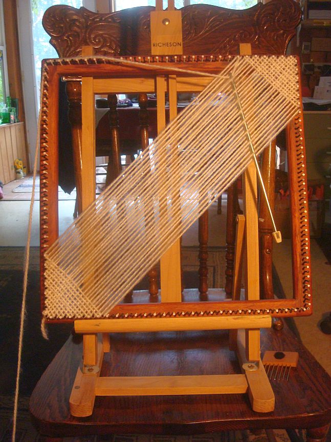But I do have a couple things to show you, meantime. This 14″ square was proving a little unhandy as a lap loom the other evening and I remembered I had this table easel over in my painting stuff so went and fetched it out. It works pretty good for this. My middle sister made one for me that sits on the edge of the table that would also work but I’m not sure where that one is at this point. But you might want to consider something like this if you’re having the same problem. I have it set on a dining chair to put it to the right height for me to work on from my chair.