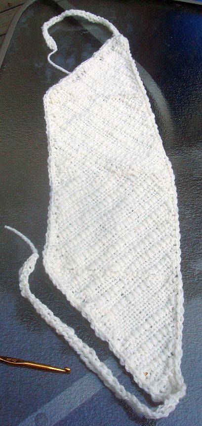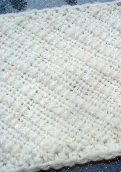But here’s what I made with the sample yarn. Two squares and two triangles, sc around the edges and a tie string. It’s an ear warmer. I’ll also try to get a photo of it on. This kind of shows the pattern stitch.