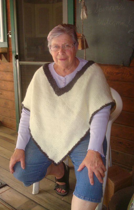 I think it worked out okay, tho a more simple garment. I know poncho’s haven’t really been in style since Martha Stewart got out of jail but I’ve never had one and thought it might really work as well as a shrug for those coolish times of the day when you don’t really want a sweater. For one thing, sleeves are difficult in the shop. The sleeves either catch on the nails or sweep them off the work table, then I have to get out my handy dandy magnet on a handle and get them up off the floor. And same thing just sitting and weaving, they get hung up on everything. Not sure this garment will work any better but I’m going to try it. After trying it on again, I think I might end up adding a couple more rows to the neckline to raise it a bit, but I might wait until cooler weather to decide if I need that. I fitted a 12″ triangle at the back neck to raise the back a bit. I just about had a heat stroke wearing this for Himself to take the photo. lol What with the smoke from the fire and the thunder storms, the heat and humidity are trapped at ground level here and it gets pretty uncomfortable. But here’s what I came up with. I’ve had some suggestions for the shrug and I have more Jiffy so it is still a possibility. But next on my to-do is tending to the peach crop!