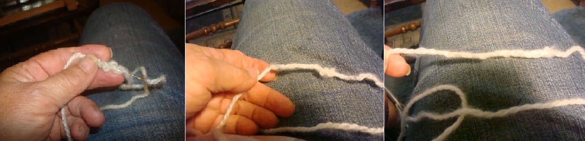 The other thing is joining. You can do a russian join, which is what I have been doing, or if you have wool, the ‘spit’ join. But I just sewed the yarn into the new piece without the russian loop and it holds really well in both wool and acrylic. It may make a bit thinner lump that the previous type join. You could probably thin it by cutting plies before you stretch the join out, but I haven’t tried it yet. Sew the yarn into next strand, pull the last end flat (after you take the needle off) then work the first end flat. If you have a little lump at the beginning you can work that out with a needle and trim it.