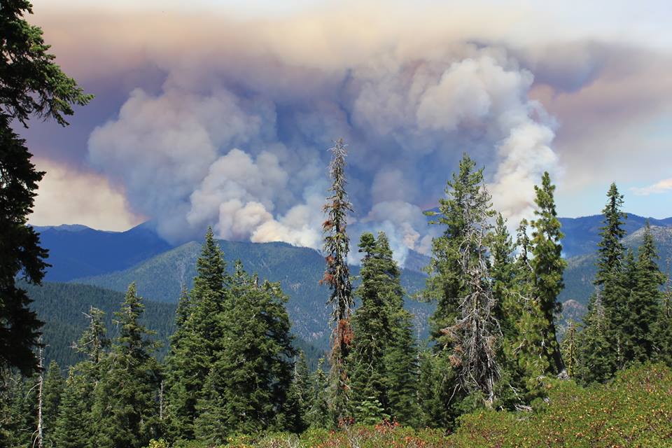 This one was taken from the East Fork road, but E Fork of the Trinity, not E Fork of Coffee Creek where the fire is. We live at the foot of this Mt. The fire is just behind and to the west (left) of it. This is what it looks like in the morning. The brown air is all the way to the ground. Weather forecast for the next few days is more thunder storms and the possibility of “heavy rain”. Do pray for that part!