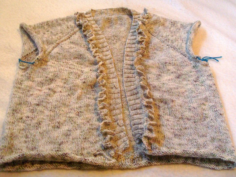 Also I have been knitting a cardigan for me. Sis was making this one and I loved it so I am combining sis’s with the vest pattern for MIL’s. Yeah, I liked that ruffle so incorporated it. Now I’m on the sleeves, except I don’t have any #9 dps so I’m going to have to take care of that first.
