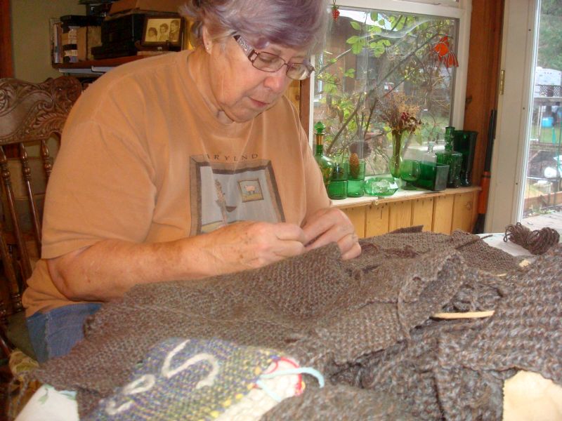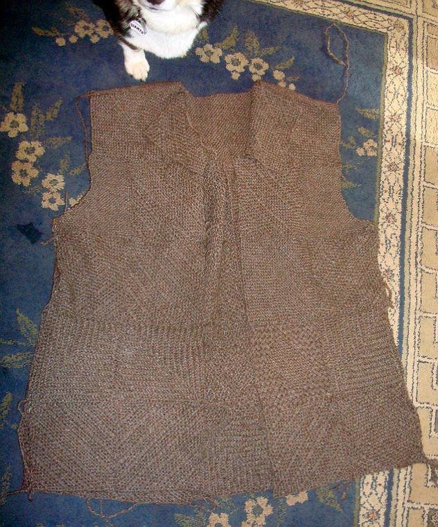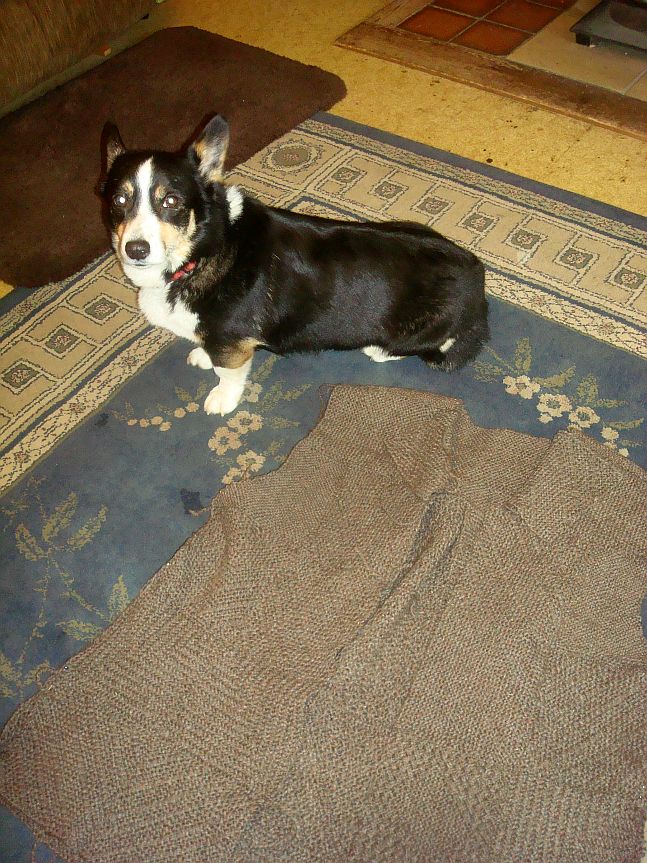 If I had not been doing this project publicly in front of all of you it would have been shoved in the back of the closet by this time, to languish, probably for years. I don’t know what it is, seems to have been jinxed somewhere along the way. The weaving went fine but I have un-stitched this thing more than any other project I’ve yet undertaken! And I can only blame gremlins because it’s just stupid stuff, sewn the blocks together backward, sewn the new strip in the wrong place. This last time I thought it was going to be too small so added a strip and found it was way too big instead so have taken that off now. I am going to make a button band, either woven or probably knitted so I am leaving the front alone for awhile and will go to work on the sleeves. It fits pretty well except for the front of the arm holes. I’m not sure what the problem is there, maybe it needs a dart. If it’s too wide it’s too bad. But it’s not really a big problem so I’ll just leave it for now. Here’s what I have at this stage. Stella thought she’d help a bit but I declined. She’s really good at showing her feeling are hurt but I was in no mood to be sympathetic.