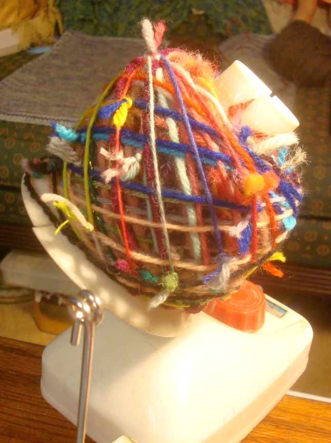 The windsock I made in April of 2008 has finally did what the plastic bag makers told us they would. It’s on it’s way back to it’s component parts. I tried to save it, but it was falling to bits as I worked . Then my eye fell on the basket of yarn snippets and scraps. The birds have never shown any interest is using this lovely nesting material so….