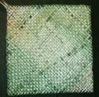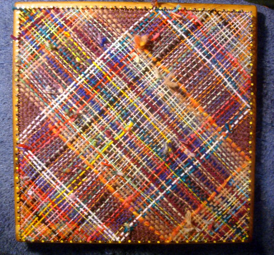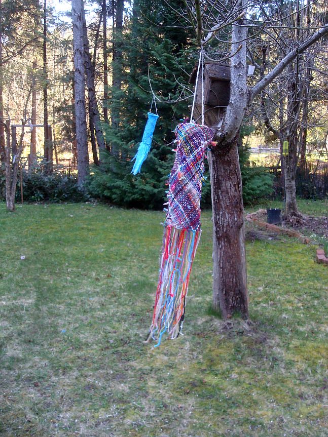 But the knot-less side looks good, too. The green is a square I wove for the one that just ‘died’. If you have a stash of fairly young bags they do make light and fluttery wind socks. Mine lasted 7 years. I have no idea how long the yarn one is going to last. They all get exposed to all sorts of weather.