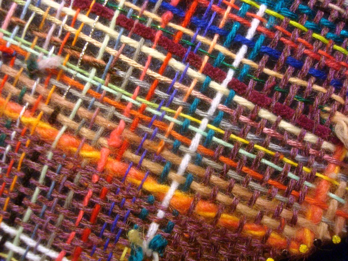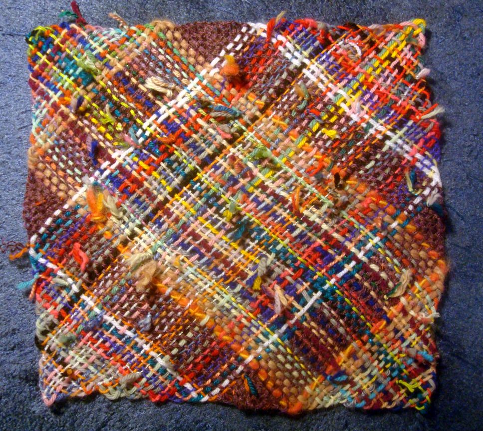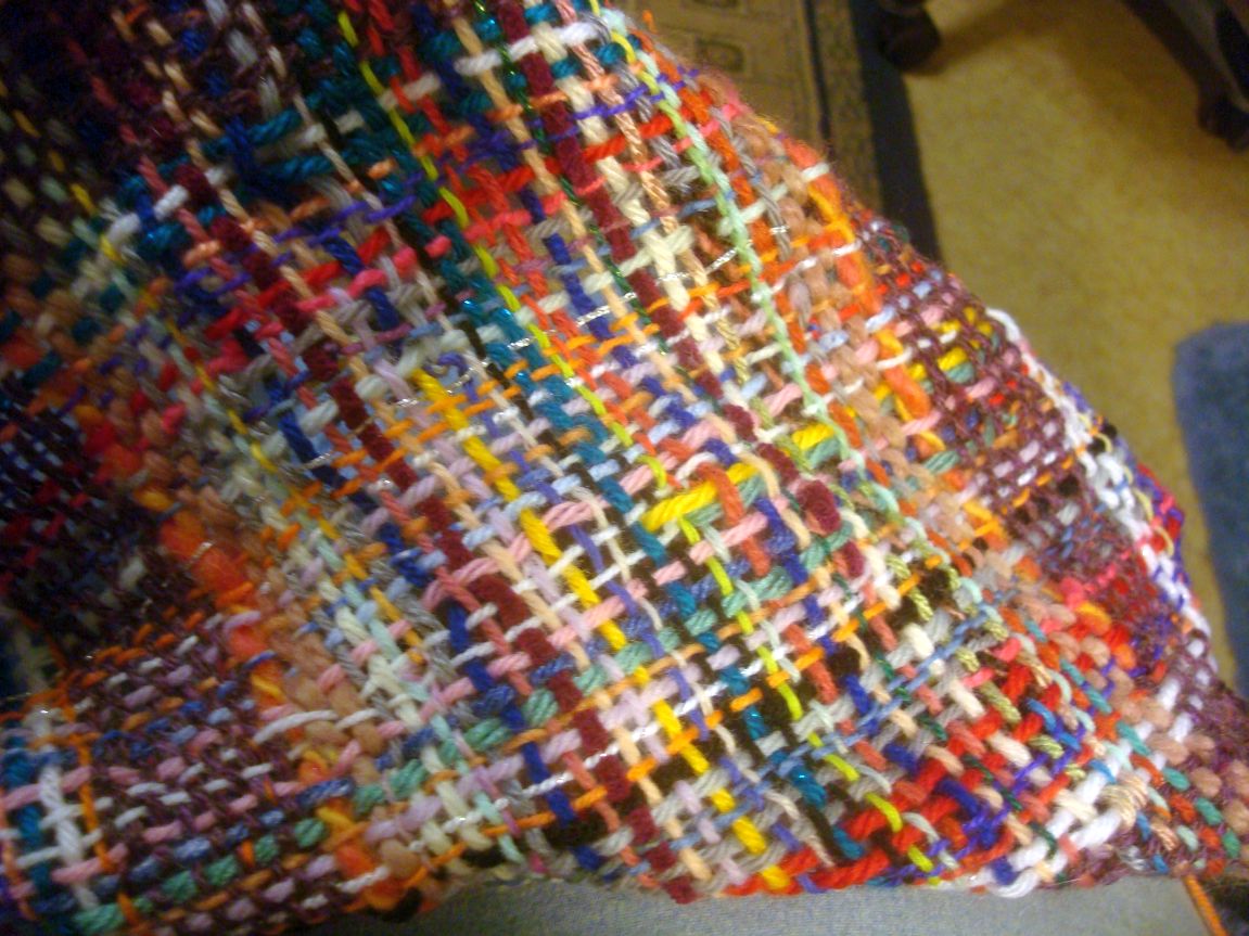 You can see that there were all sorts of bits in the basket, lace to bulky, wool, acrylic, mohair, cotton… I picked randomly and decided on the spot if it was long enough. It’s mostly pieces from about 4″ to several yards in one case. And I decided that the knots were a design element so pulled them all to the right side.