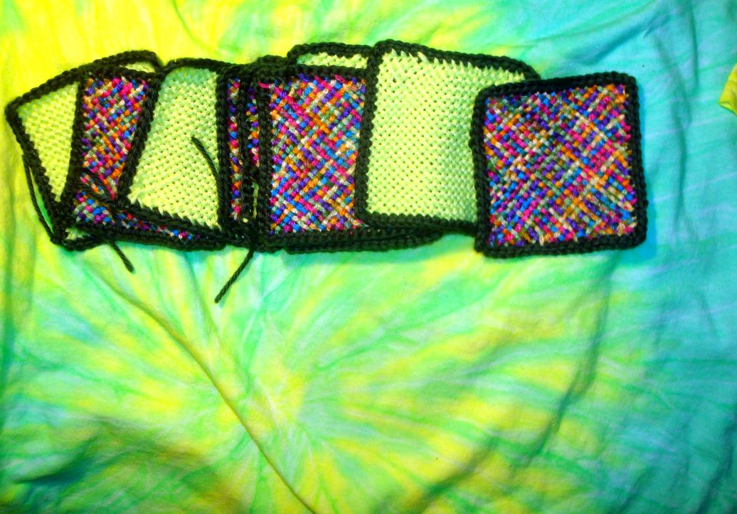 Got this Tee at a fair last year, forgot which. Did not work with the yarn I had in mind so am now using this neon Simply Soft acrylic to weave on the Tiny Weaver square. It’ll be another yoke for a top. Has to be machine washable for me. I think it’s going to work. I wove the blocks and am now working a single crochet around each one. I think I will then just sew them together with an overhand stitch. Not exactly camo, huh?! Much as i enjoyed the natural covers of my last project, I thought it was time for something Bright!