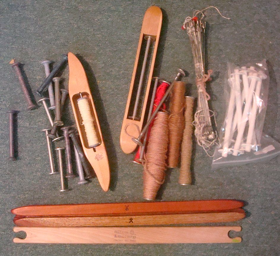 Boat shuttles, stick shuttles, some extra heddles, lots of bobbins. Boat shuttles run around $40 depending on size and brand.  Sticks around $10 each. Mine are used but not very much. Lots of bobbins.