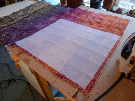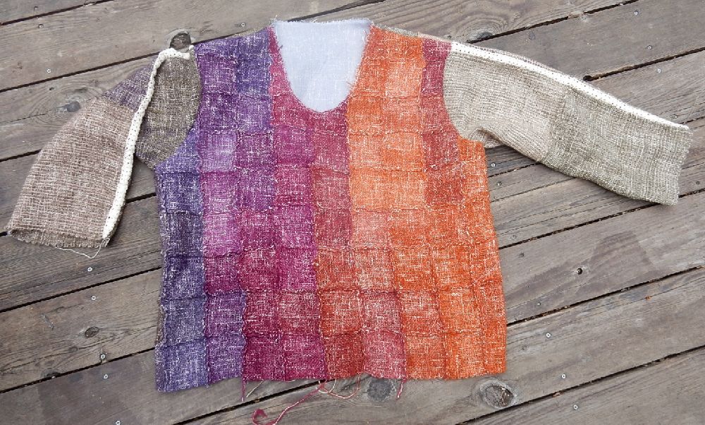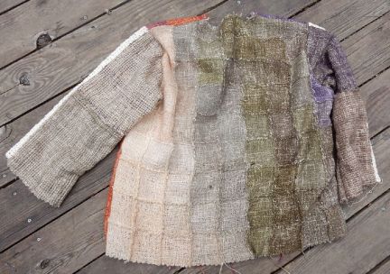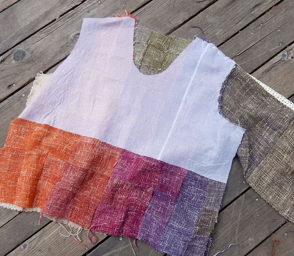 2. Wind a warp with the colors of your top and weave the neck edge right on the edge… the way South American weavers do – a tubular band. It will be a little harder on the curve but maybe you can ease as you go. The weft is threaded on a needle and goes through the fabric that you are edging. Probably safe to say you might want to zig-zag the edge first or use a fray stopping treatment.