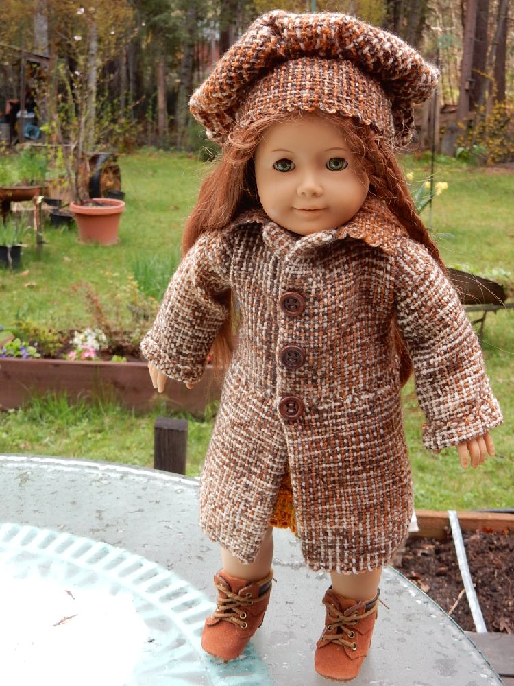 I am still weaving the blue yarn for the nest project but meantime was rummaging though my kitchen trash bag full of this and that, experiments, trials aborted projects, you know, you all have them, and found these squares woven in a muddy brown. So I put them to work as a coast for the girls. I’m calling this one Puddle Jumper because of the color! There was a 12″ square of the same yarn which I managed to turn into a sort of baggy tam. I frogged a couple of extra squares so I could weave the band. I am quite please with the way this spur of the moment project turned out! It’s spring I think but still quite chilly here! And I think it looks good with Felicity’s red hair.