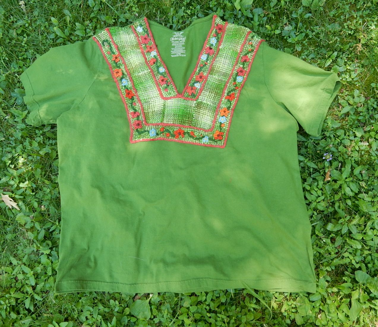The Green Thumb Top is done. The shirt looks nice but I am not very good at the selfie thing! Here I am with my mouth open.. no comments on that, please! But it fits well tho it’s probably a good thing my cleavage is a bit lower than it used to be! As you can see it kind of wandered away from the original sketch, but that’s the way projects usually go. I’m happy with it.