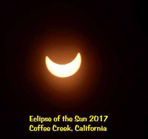 Himself and I had our “Eclipse party” out on the deck this morning. It was pretty cool, actually. I bought the proper glasses at Lowes, I think it was, and am glad I did. Even tho he laughed at me at the time, he used his, too. We got to 88.something % here in Trinity Co in north Calif. That left just a sliver. I could not really tell the difference in the light from a partly cloudy or smokey day, but I could really feel the temperature drop. It did not get cold, its August after all, but it did get noticeably cooler. I managed to get a couple pictures to focus. I know there’s going to be a zillion better ones around but I just kind of wanted my own. It got much thinner than this but I could not get another one to focus.