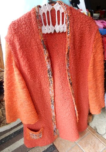 I decided on two projects. First, a fast one with a new yarn. It’s called Bernat Maker Home Dec & says it’s 72% cotton & 28% nylon. I wanted to try it for a dishcloth. I wove the ends in and then secured them by sewing the ends in with sewing thread. I’ll let you know of it makes a decent dish cloth or not. The skein comes with a crocheted blanket pattern. The yarn “tube” is about the size of a #4 knitting needle, quite elastic. It’s a knitted tube with a tiny bit of stuffing.