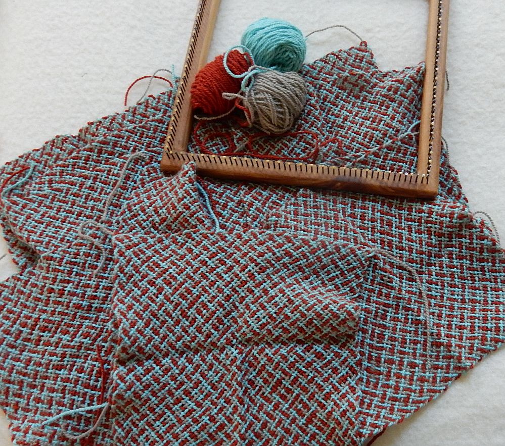 I am just one shy of halfway done weaving my blocks. Counted 11 today. Yeah, not nearly one a day, but I think I denied that possibility right from the start. But now that Baseball season has started I will probably get more done as I can do that and listen to the game at the same time! I think they are looking good (the squares, if not the team) but also they seem to have a little more draw-up than I figured on so I’ll likely end up needing more squares. Which may mean some creative coloring in order to do it since I have a limited amount of this yarn. Well, I have never objected to colorful so we’ll see.