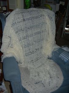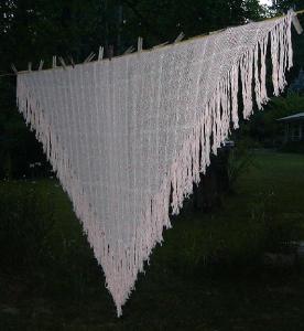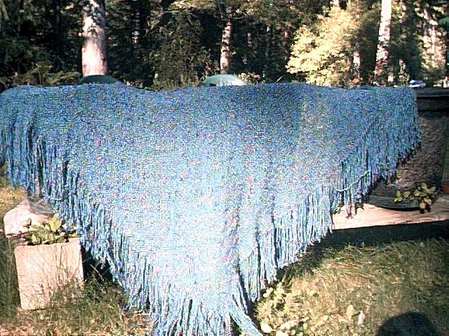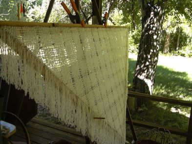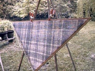 The email I got from the wordpress tutorial today wants me to “create a feature” which is a post I commit to making posts on a subject at regular intervals. I think it’s going to have to be about weaving. You may wonder where the weaving content has gone these days. Well, it’s spring and gardening season, but weaving is still important here and still happening tho slowly and pretty much in the background just now. However… keep watching! I am going to do this! Meanwhile, a bit of history, here’s what I did when I started out in this type of weaving. It was a 7′ hypotenuses triangle for shawls.