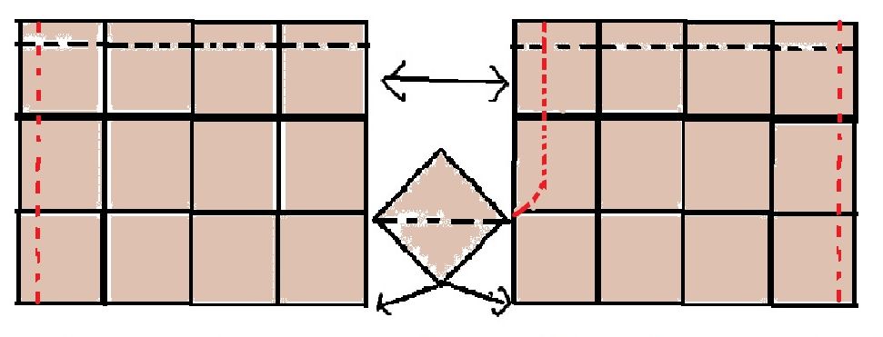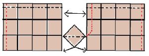 Now as I have had questions about how to assemble this crotch, I’ve changed my mind about how I’m doing it and will do it the flat way. My square measure 6″. So laying them out with 3 squares will give me a 36″ waist. But if you have a 36″ waist, you are not likely to also have 36″ hips.  Well, men might but women aren’t likely to. If I manage to ease in one more square it will give me 48″ hips.  That also makes the leg opening 24″ which may be a little loose for shorts. All these things have to be adjusted by your size and your taste. This is where the design comes in! And do remember!!! You are not weaving squares… you are weaving Fabric! You can treat it like any other coarsely woven fabric. You’ll need to sue some kind of stay, whether iron on backing or just sewing a stay stitch, before you cut. I am going to start assembling these shorts today and will take photos of inserting the crotch gusset.