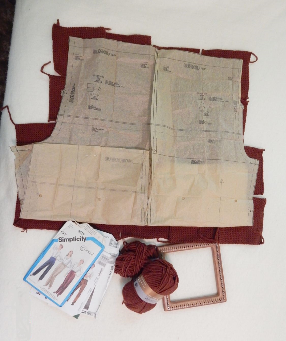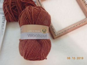 So here’s what I have so far. I tried several yarns on both the Quilt Weaver and the Multi loom and didn’t find anything I liked. I was thinking cotton but the cottons I ave are either too small to make a nice fabric with the Quilt Weavers or too heavy to make it on the Multi Looms. sock yarns were a little too light for my liking on the multi as well. and I wanted a yarn that would not stretch to leave holes once they are on the moving body. I finally ran across this box I got from Lion Brands 10 for $10 sale.  Had no idea what to do with it when I bought it but it was a ‘deal’! It weaves up very nice on the 7″ Quilt Weaver square. A snug weave without making a stiff fabric.  It’s Lion’s Pride Woolspun, 80% acrylic, 20% wool. A Bulky Woolease.