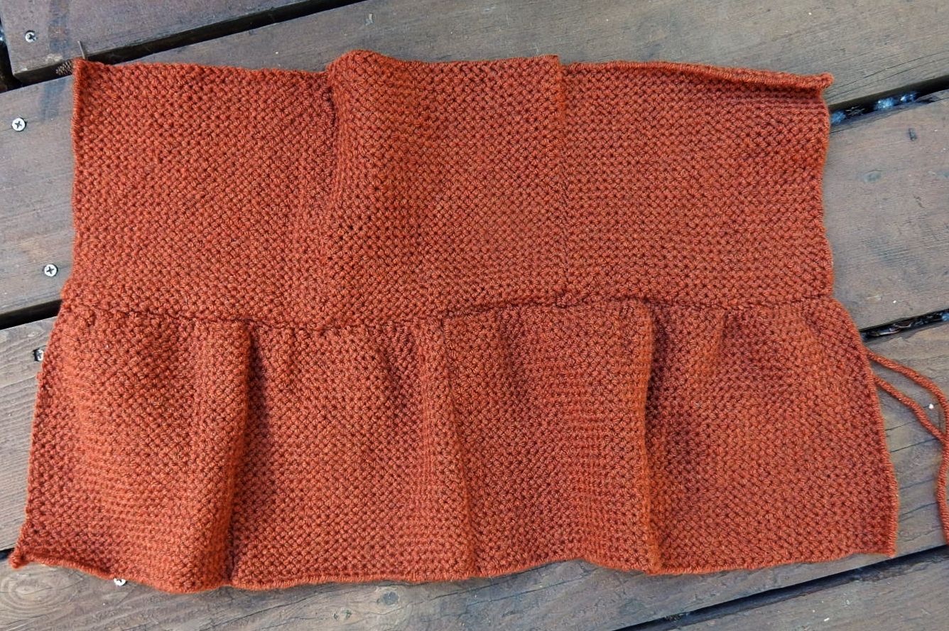 I’m not really happy with the way this is going. The project, that is. This yarn makes some nice sturdy, yet soft fabric but trying to ease in an extra 6 inches isn’t going smoothly. I’m going to go ahead with it, bit I think I won’t weave in ends just yet in case I have to frog it later. A lighter fabric wouldn’t be a problem, I think, so don’t be discouraged by my comments. I’ll post another comment & a photo once I get the next tier on.