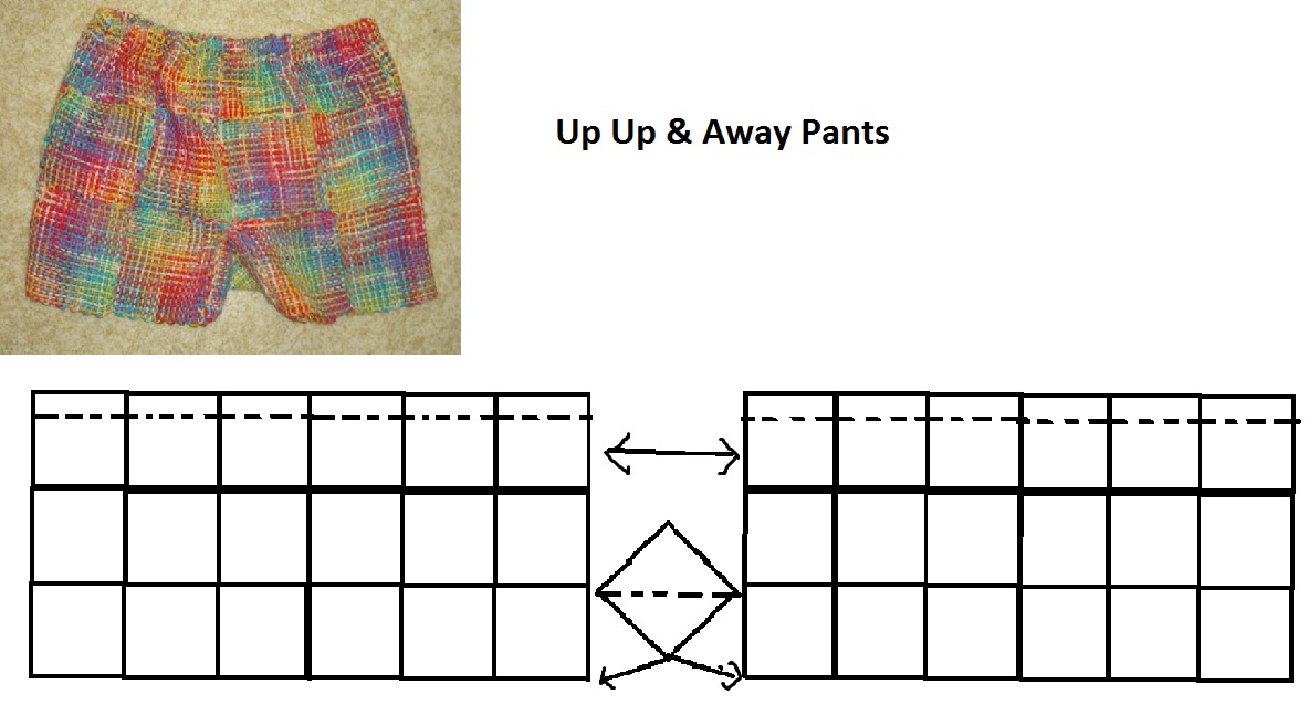 This is Charlies, Pants, done with the 3.5″ Tiny Weaver Square. You could use your 4″ multi but be sure to check the measurements. Add squares top or side to get your fit. This would be for a child. your going to need many more squares for yourself, no matter what size you are and if you are using the 4″ make your crotch insert with the 6″.