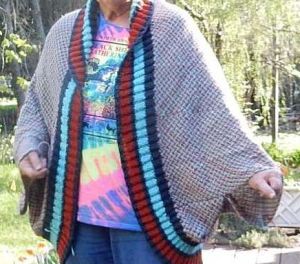 Or how about this one. That goes way back! In fact, I think this one was woven on my first triangle loom, and adjustable 7′ tri. It’s supposed to be a cowboy style jacket. Not even sure what happened to that or whether it’s still around.