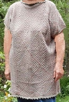 Another bad idea. Saw a picture of a knitted “cocoon”. Seemed like a great idea so used some nice alpaca to weave a bunch of 12″ squares and put them together into the same shape. Knitted about 100,000 rows of ribbing around it. Nope- definitely not. So I frogged the ribbing and ended up with this. It looks better on my ‘dummy’ with a belt. And has since been washed and pressed, which also helps but it was a hit on her at the last show.