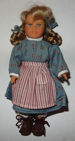On the more cheerful side, I’ve finished with the peaches. We have a bowl of sliced in the fridge for dinner and then we’re done for another year. I’m knitting a “meet dress” for my new used American Girl Kirsten. That’s been interesting making up the pattern as I go along. As you can see from the pro photo, I have a way to go! I’m thinking I may embroider one row of little red flowers on her bodice but no way are they going to be all over!
