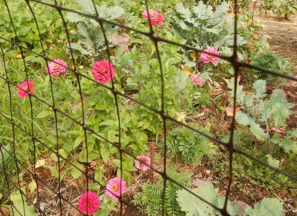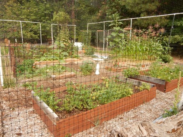 The long view of the garden that’s my potato bed ther in the front. his corn, cucumbers on the trellis and really giant sunflower out in the middle. it planted itself, likely with the help of the jays last year!
