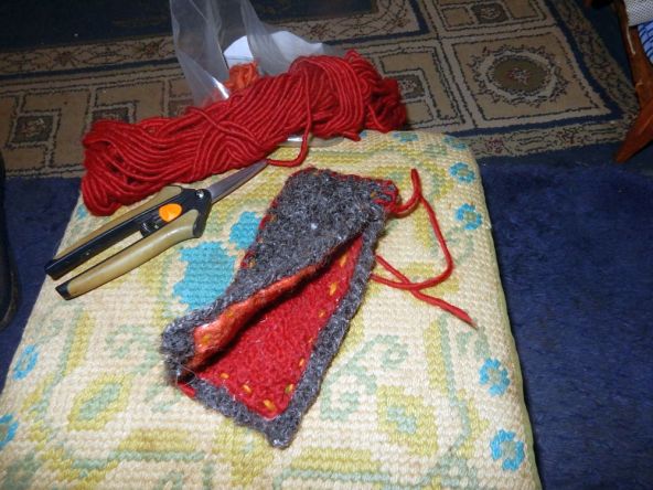 So now I see that the Brown Sheep felted up nice and tight, the hand spun less so but still good. I decided that the Brown Sheep were going to be a little too small for my project and that both were still a little thinner than I wanted for a pot holder. So I sewed the smaller ones to the larger to make my holder a double thickness. Then I used a blanket stitch to sew the two pads together.